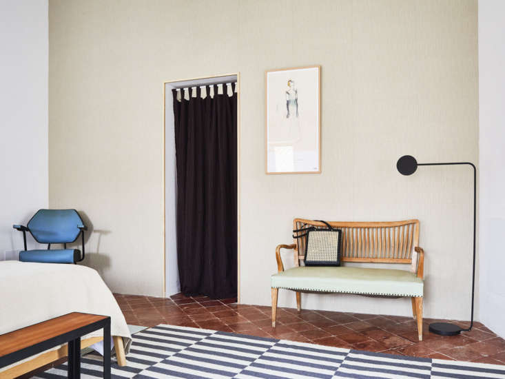 Above: In another room, a single wall is wallpapered with the Waverly Kids Highwire Stripe pattern from Aribau. The bench, a Catalan modernist piece, was sourced a vintage antique dealers show, and the rug is simply the Ikea Stockholm 2017 Rug.
