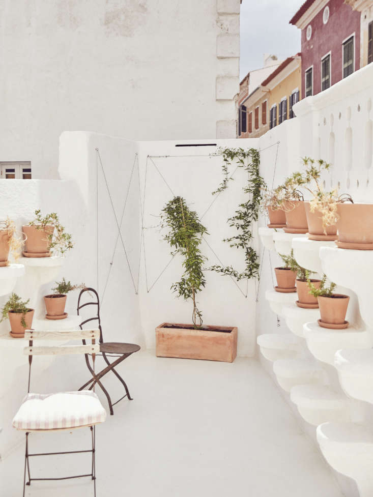 Above: A private balcony off the guest room bath with more terra cotta by way of new planters, and in-progress vines trailing up the plaster walls.