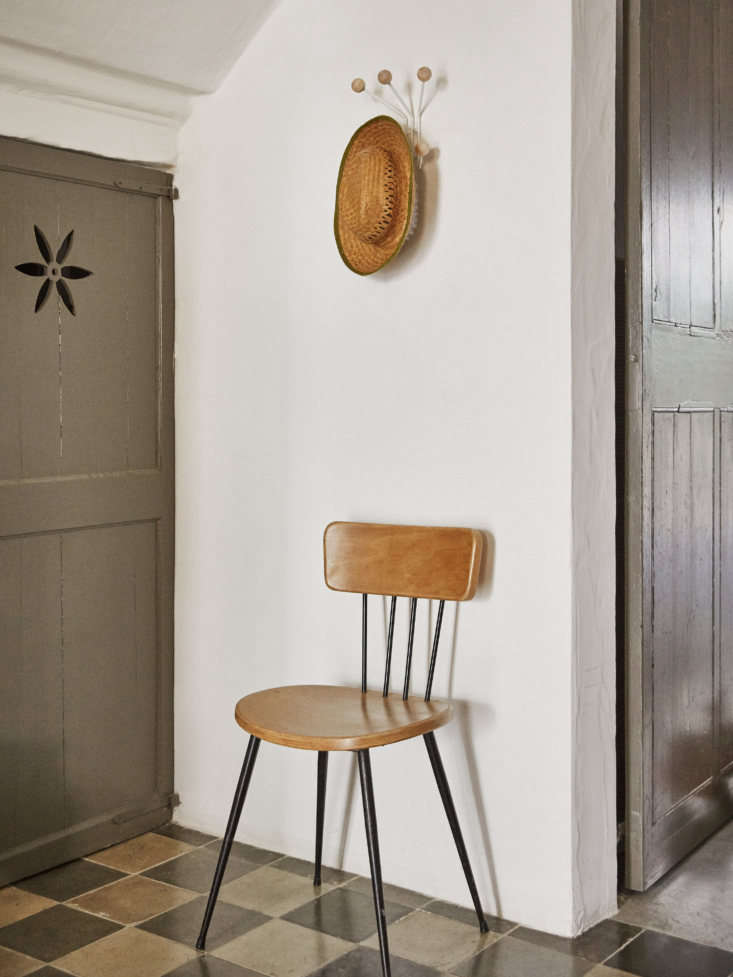 Above: The original tiles from 1844, a vintage chair, and the Maze Bill Coat Rack at the base of the stairs.