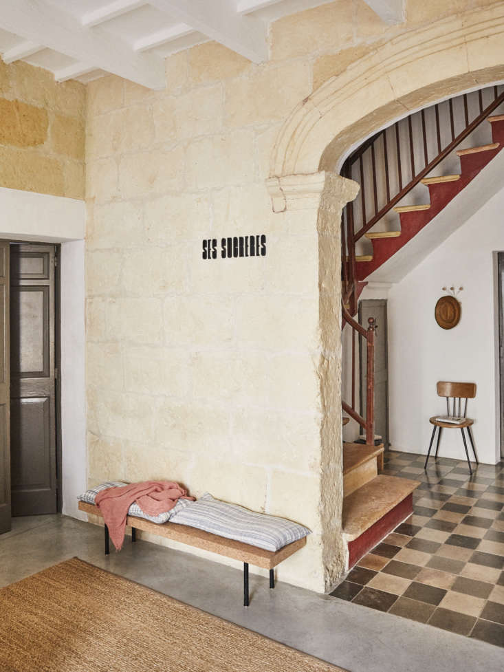 Above: In the entry, the original stone walls meet newly polished concrete and a bench designed by Ilse Crawford for Ikea’s former Sinnerlig collection.