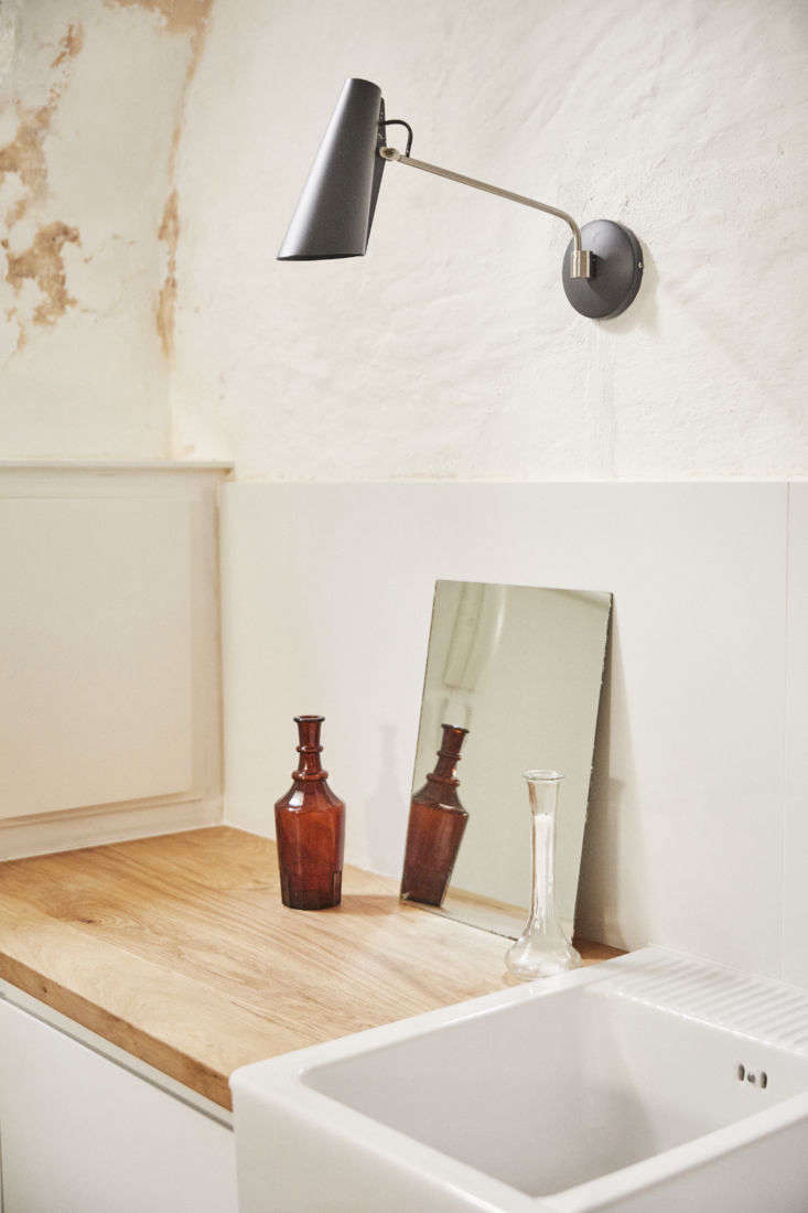 Above: The Birdy Wall Light is seen again in the kitchen, along with a double-bowl farm sink and vintage glass vases.