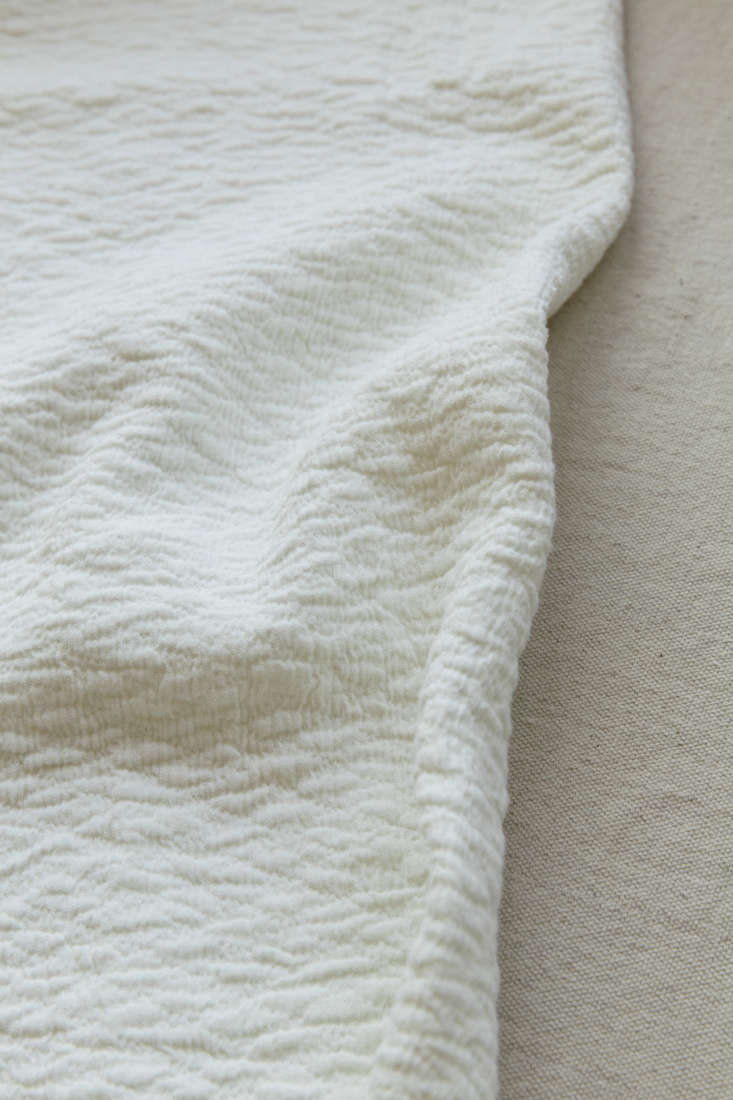 Above: Subtle textures: the cotton/linen blend of the Origami Coverlet and, at right, buttons and a neat hem on the duvet cover (which I plan on using without an insert in the summer months).