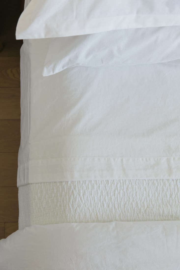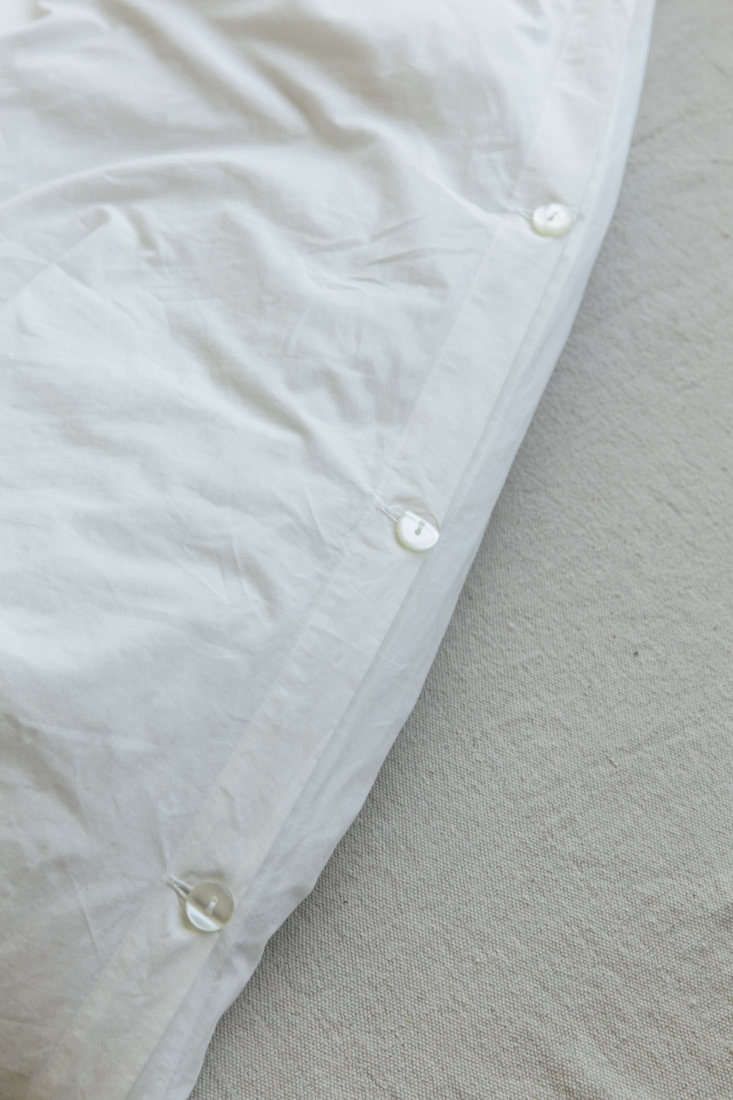 Above: Subtle textures: the cotton/linen blend of the Origami Coverlet and, at right, buttons and a neat hem on the duvet cover (which I plan on using without an insert in the summer months).