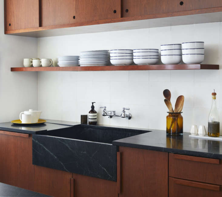 Above: “We love the custom cherry millwork, from the sliding panels to the integrated handles, and the beautiful black soapstone counter with apron front sink and integrated drainboard,” says Barbara. The wall-mounted tap is from Chicago Faucets, one of our favorite sources for faucets. (See 10 Easy Pieces: Traditional Wall-Mounted Faucets.)