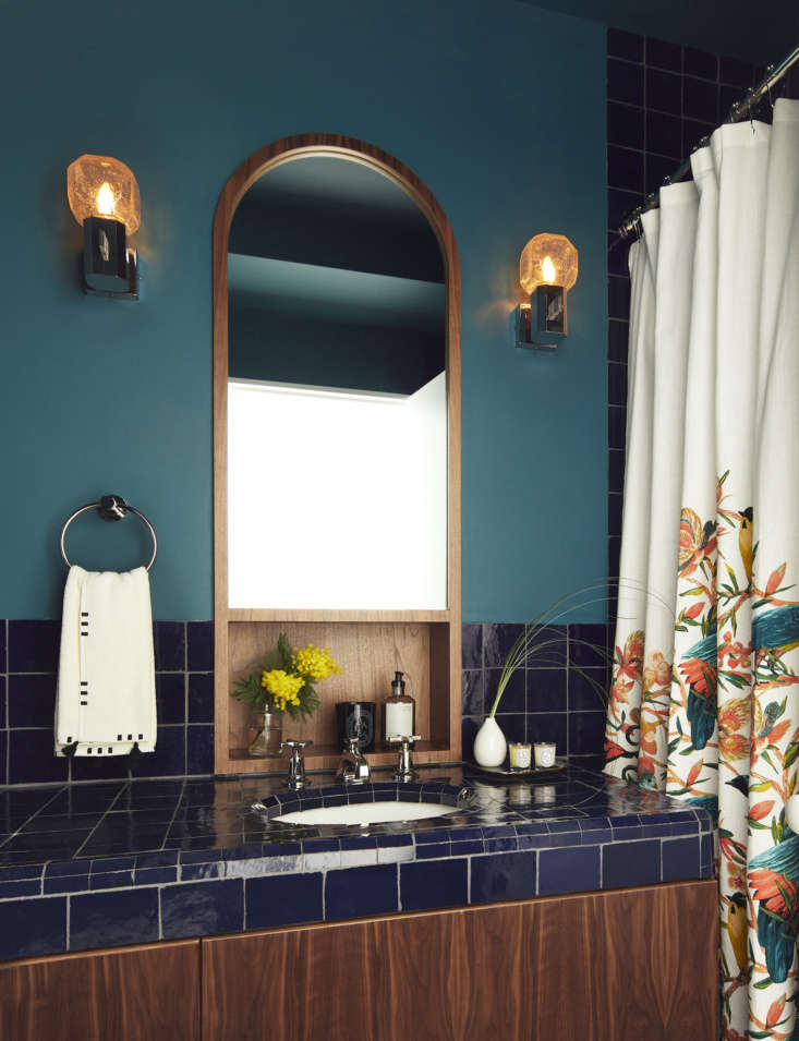 Above: In the guest bath, the walnut millwork and mirror were custom-designed by Frederick Tang Architecture. The zelig tiles are from Mosaic House; the German theater wall lights are by Cosack from 1stdibs. (See Water Colors: 10 Favorite Bathrooms with Retro Colored Fixtures.)