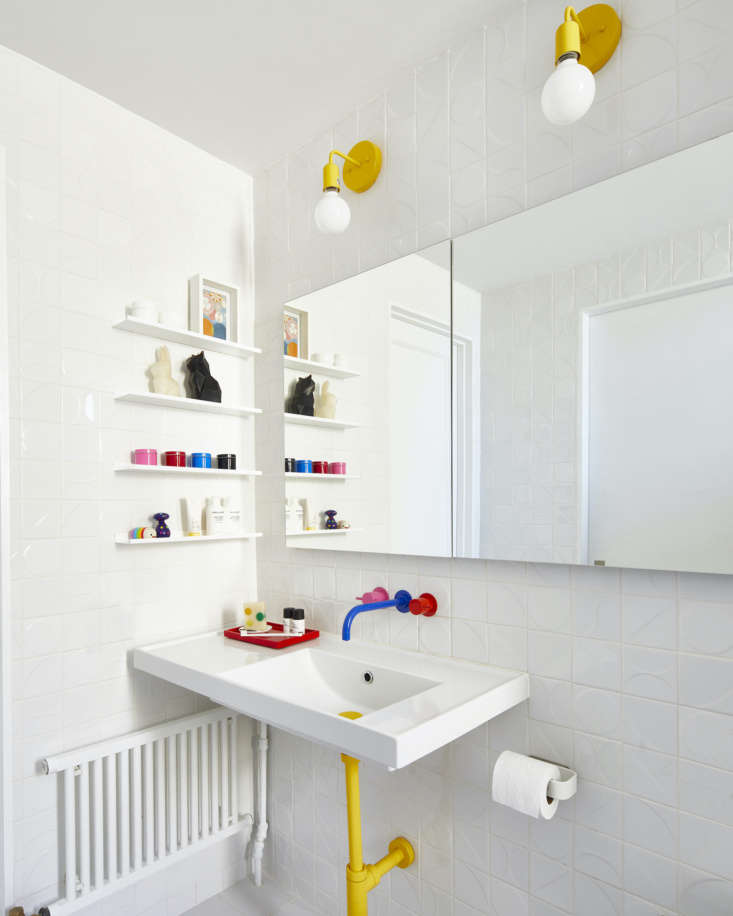 Above: “We knew we wanted this to be playful and cheerful, but not thematically ‘kid’-like,” says Frederick of the bathroom for the clients’ young daughters. “This bathroom really started with the tile [which has] geometric shapes in relief designed by Kho Liang Ie for Mosa. The tile felt perfect for this project—simple and neutral but with fun geometric texture.” The mix-and-match colorful plumbing fixtures are by VOLA; the wall lights from Barn Light.,