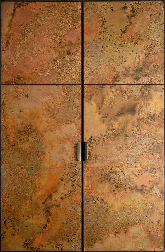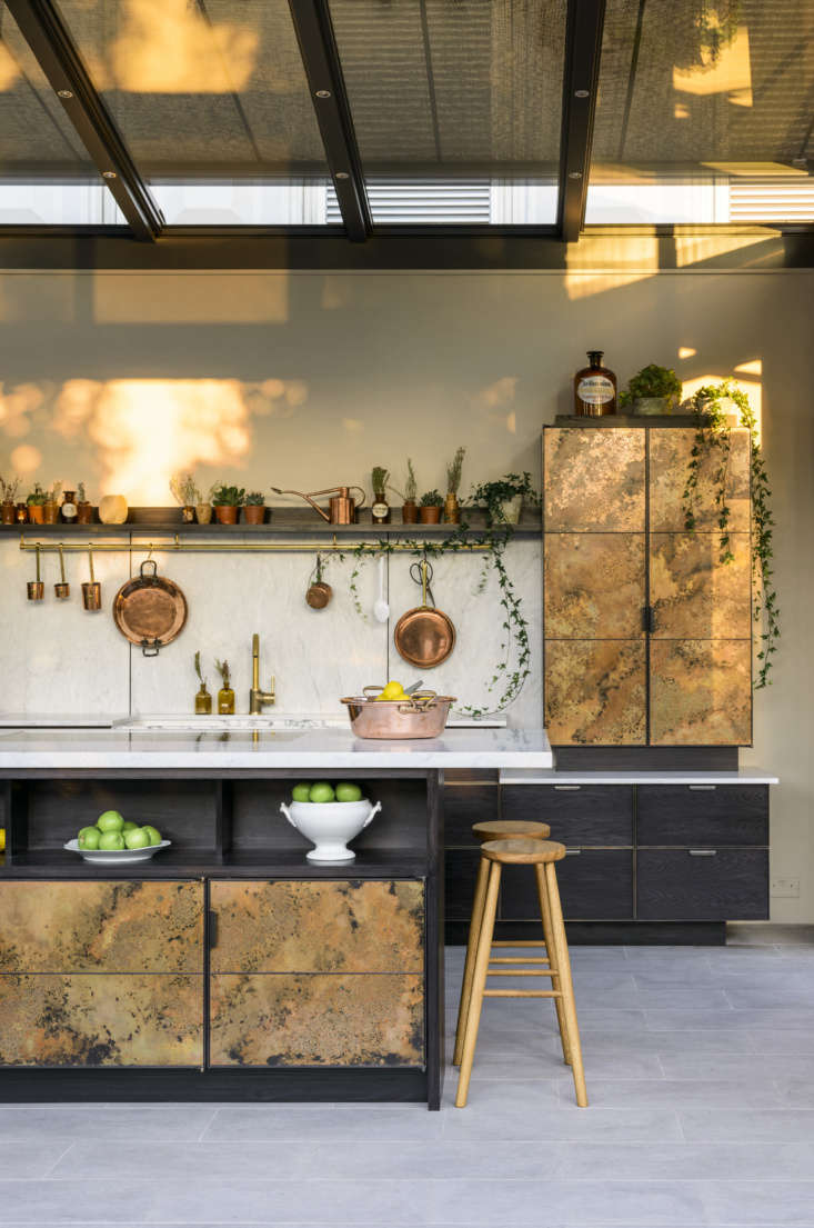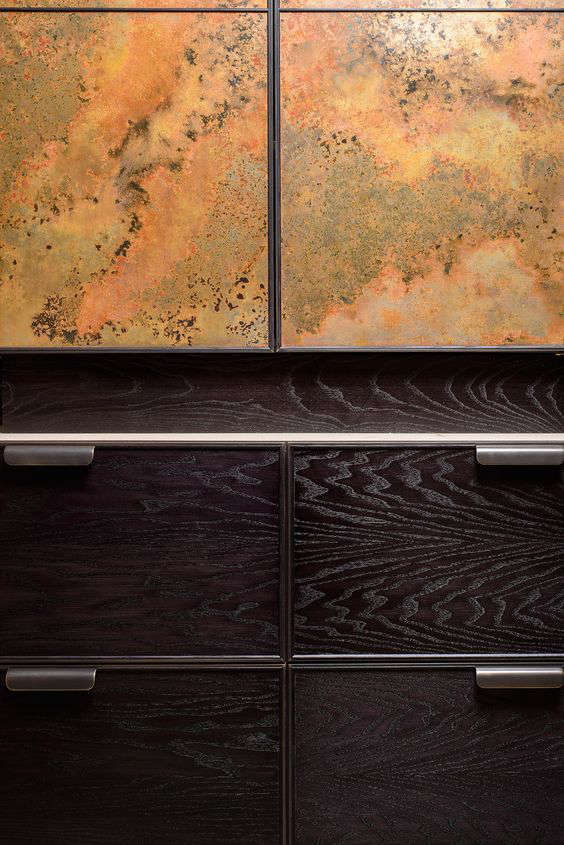 Above L: “Since opening our metal studio last year at Cotes Mill, we’ve been able to greatly expand our vocabulary of materials,” says O’Leary. The copper panels are individually treated with an antiquing fluid to create their patterning. They’re then oiled to preserve the finish—slowly, over time, the copper will evolve or require re-oiling. Above R: The cabinets are paired with ash drawers that are detailed by thin, dark brass cockbeading, a decorative and protective molding updated from traditional woodworking. “This framework allows us to introduce an infinite variety and number of facia panels for our kitchen fronts,” says O’Leary.,