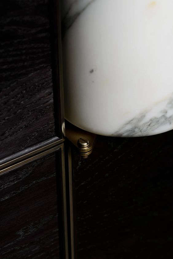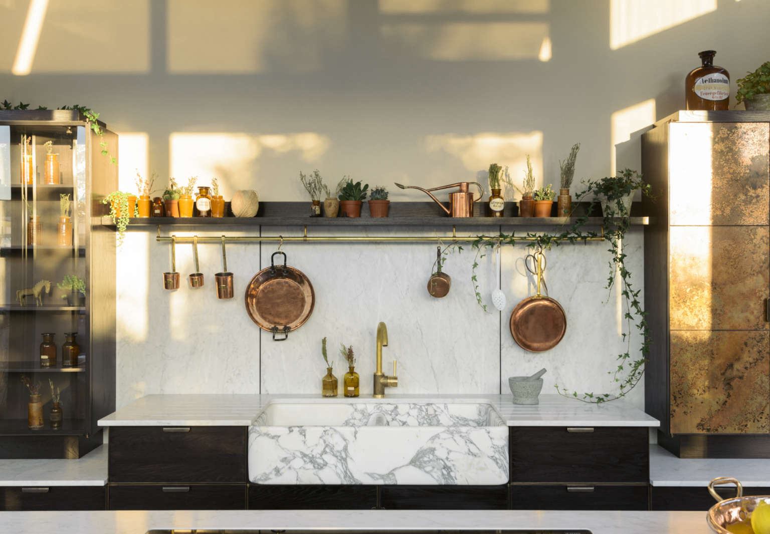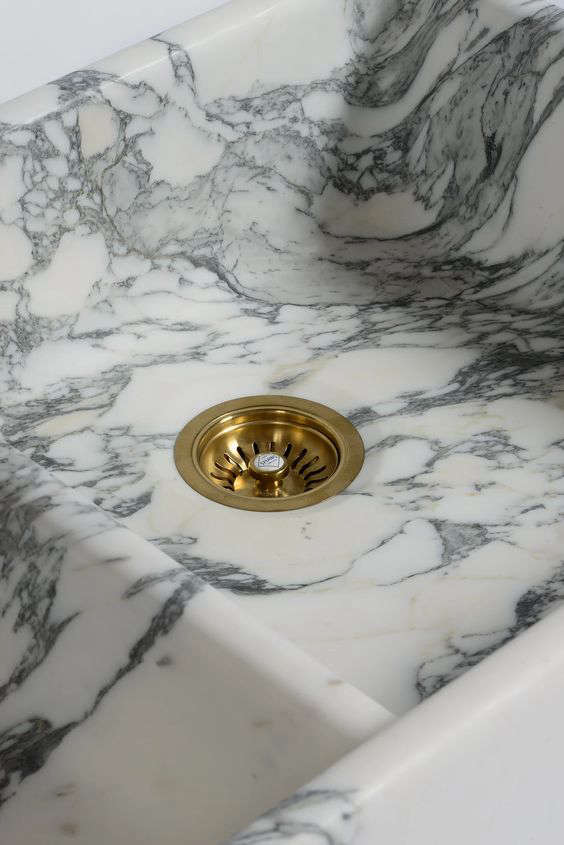 Above L: The Tuscan Farmhouse Sink, the newest offering in deVol’s lineup of marble farmhouse sinks, was sculpted from a single block of Arabescato marble. Above R: The cabinets have cast-brass pivot hinges that were inspired by Crittal windows.