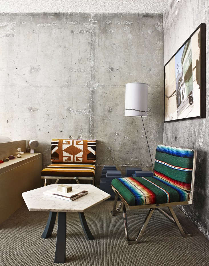 Above: “We started with the concept of repurpose–use as much of the existing structure as possible, and take materials that would not usually be considered luxurious and elevate them through substitution,” says Knibb. Towards that end, he photographed the structure’s exposed concrete and then had it turned into wallpaper, which is actually what lines the walls of the rooms. It was custom made by Astek in LA. Each room also has a chair upholstered in a vintage Mexican serape, a painted coffee table with a “cityscape” built from books, and a photo collage by Kevin Hanley of LA’s Acme gallery. Knibb Design created the rakish lamp.