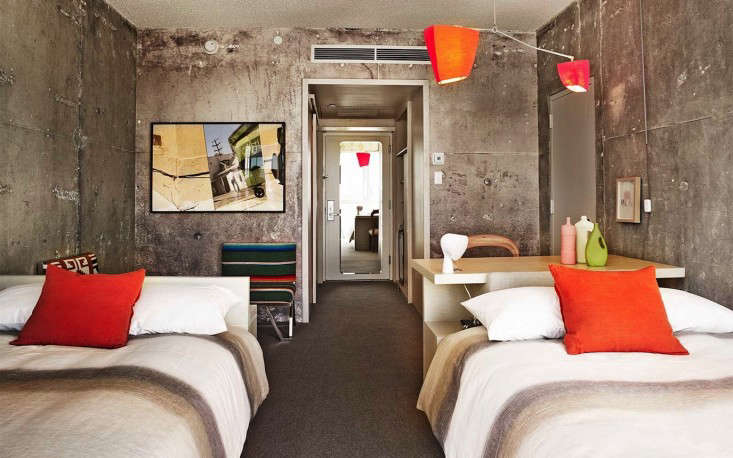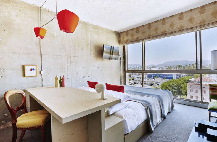 Above: Situated to take in the sweeping city views, the beds have desks as headboards–”to maximize the space and give the guest a large commanding workspace (or place to put their things) that faces the window,” says designer Sean Knibb of Knibb Design in LA.