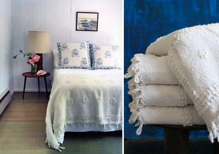Above: New York designers Roman & Williams use a Temoayan bedcover in their own Montauk house; Laura Aviva sources her handknotted Temoayan Blankets from Temoaya, a town in the state of Mexico. The blankets are “woven on wooden looms using virgin undyed cotton and represent a fusion of ancient Persian carpet making techniques and modern Mexican design.” A twin/full size is $285 and a queen/king size is $345.