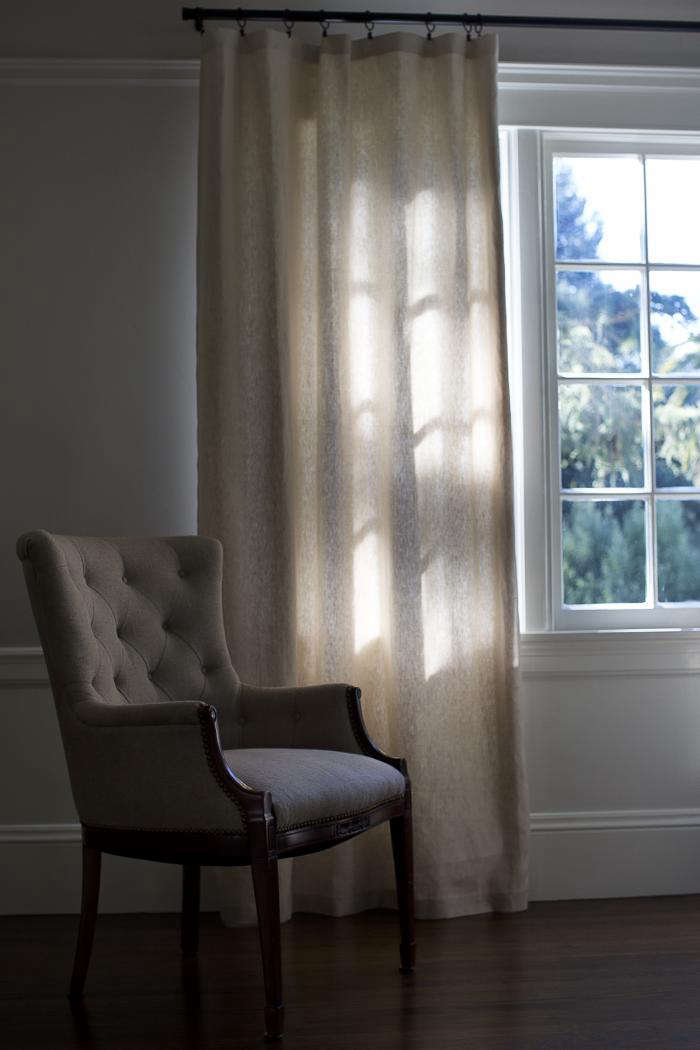 Why choose curtains (instead of blinds, say, or shades) for some windows? Says Tang, “It is a classic trick to use curtains to enlarge the visual effect of window. Often people will place them bunched up a foot or two off to the side of window, so will look as if a window is bigger.”