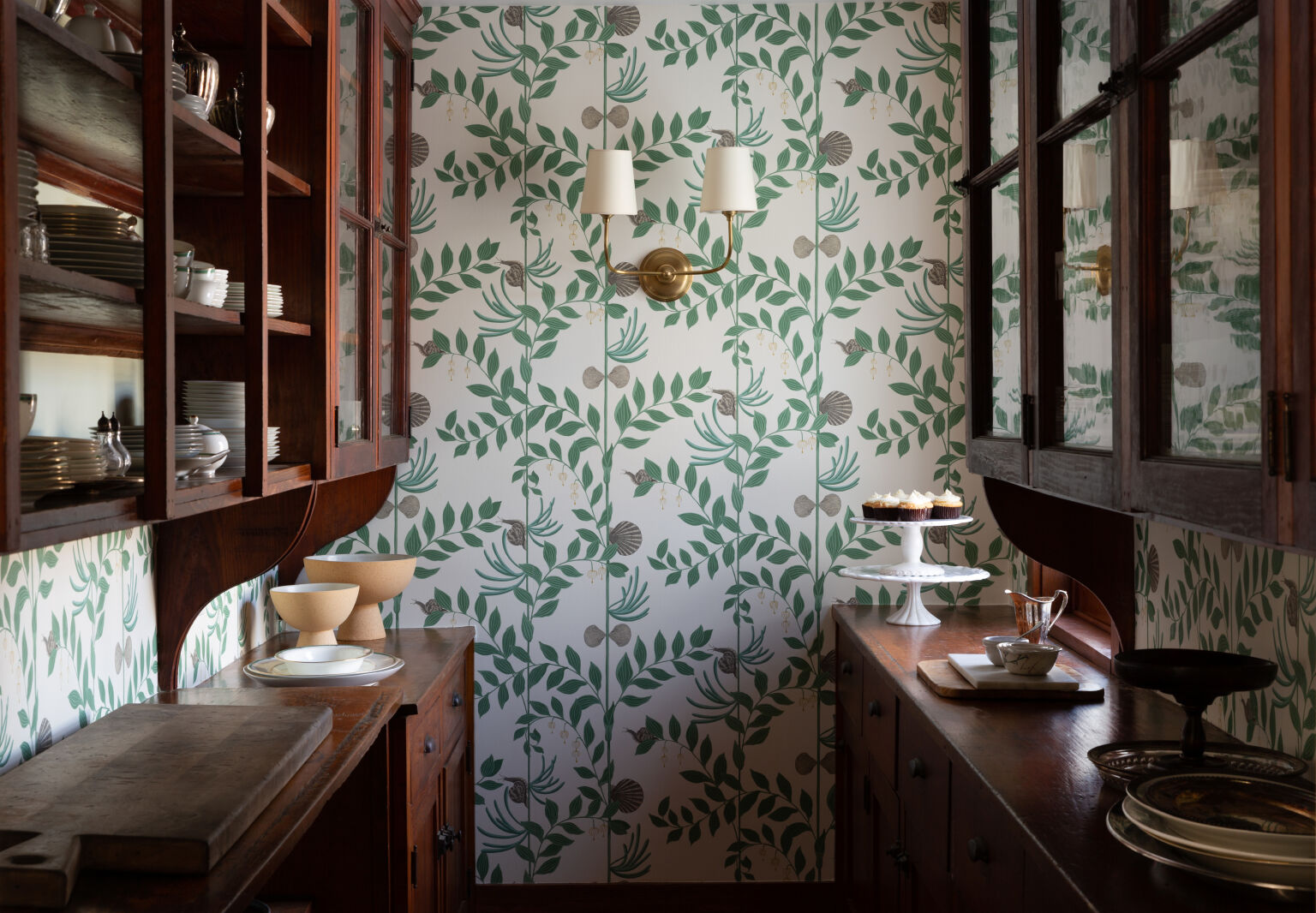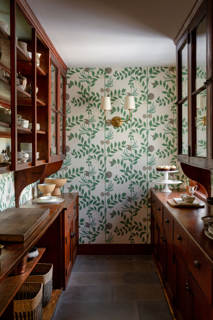 Above: The designers used the pantry’s Douglas fir built-ins as inspiration for the kitchen cabinets (and unnoticeably stole space from the outsized storage room to create a powder room). They spiffed up the walls with Secret Garden, a botanical wallpaper from Cole & Son and a brass sconce from Visual Comfort.
