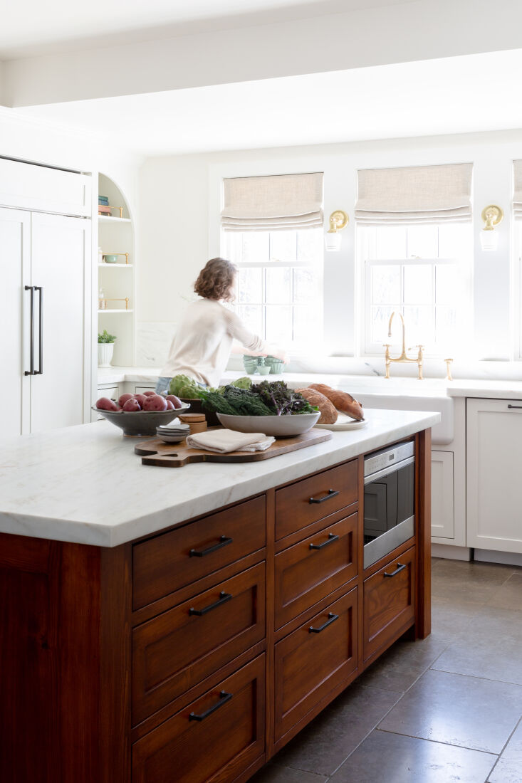 Above: The twin arched cabinets “follow the lines of an original built-in hutch in the dining room,” says Jess. Like the island, they’re made of salvaged Douglas fir and are fitted with old-fashioned oil-rubbed bronze Cremone Bolts from Signature Hardware. The range is a 48-inch Wolf. The island top, counters, and backsplash are honed Imperial Danby marble. The adjacent cabinets are part of the mud room.,