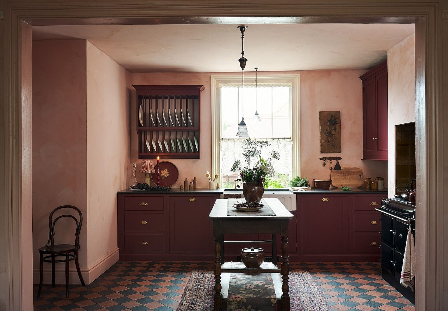 Above: She chose cabinets from deVOL’s Real Shaker Kitchen line, in Refectory Red, with Boho Handles. The Plate Rack is from its Heirloom Collection.