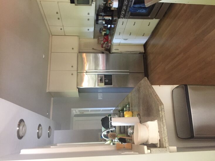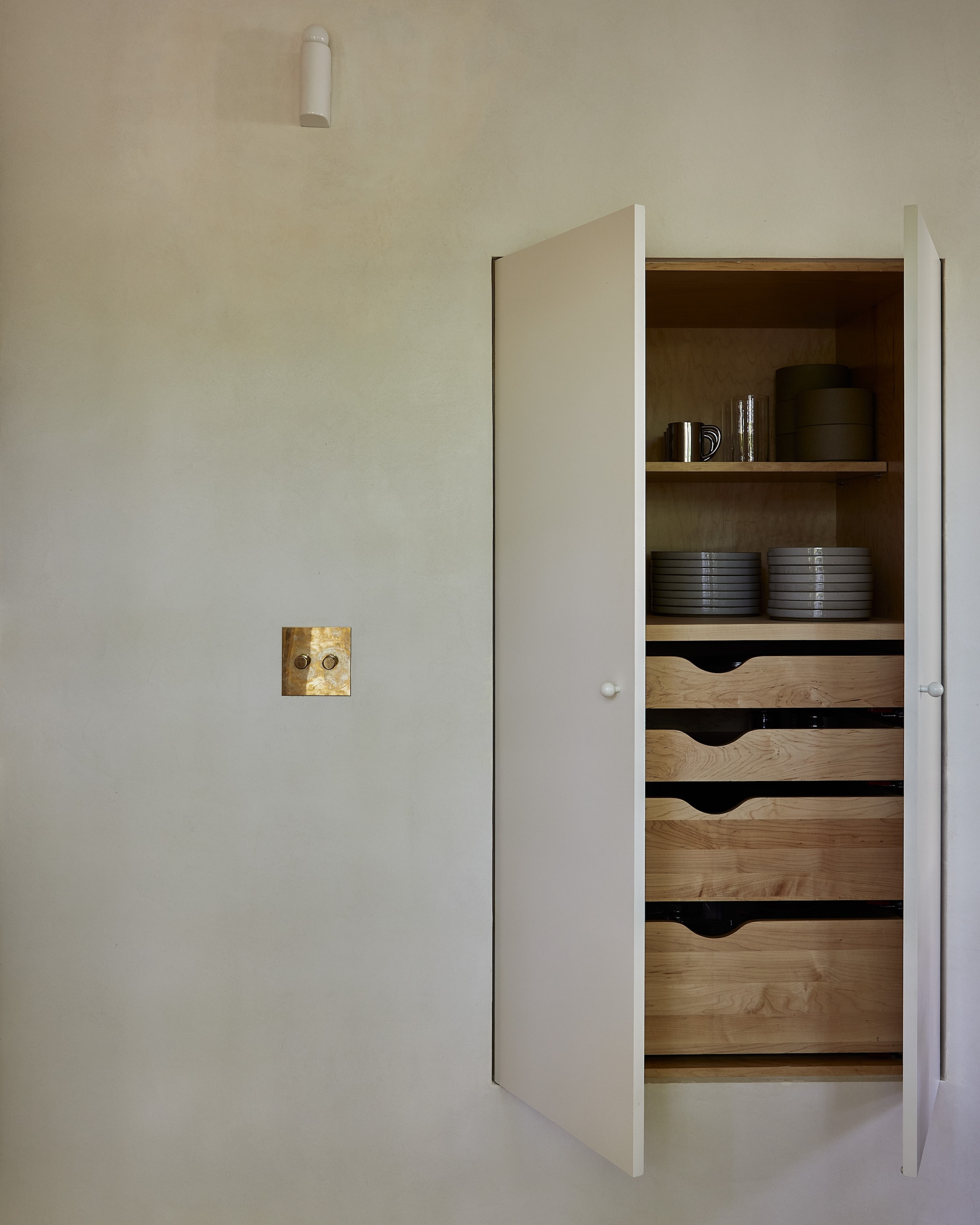 The fridge is integrated into a wall of custom cabinets painted Farrow & Ball’s Pointing. This “pantry volume” serves as a room divider and performs a multitude of duties (see floor plan below).
