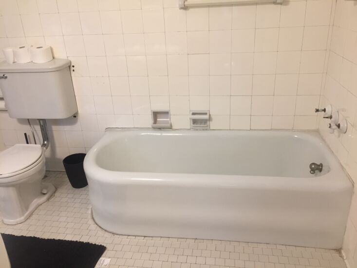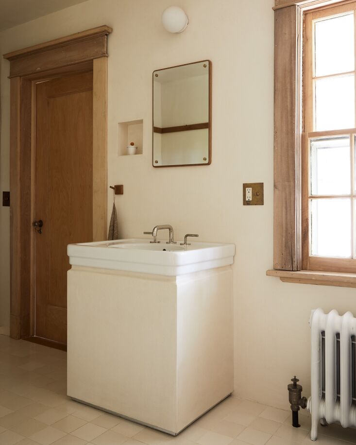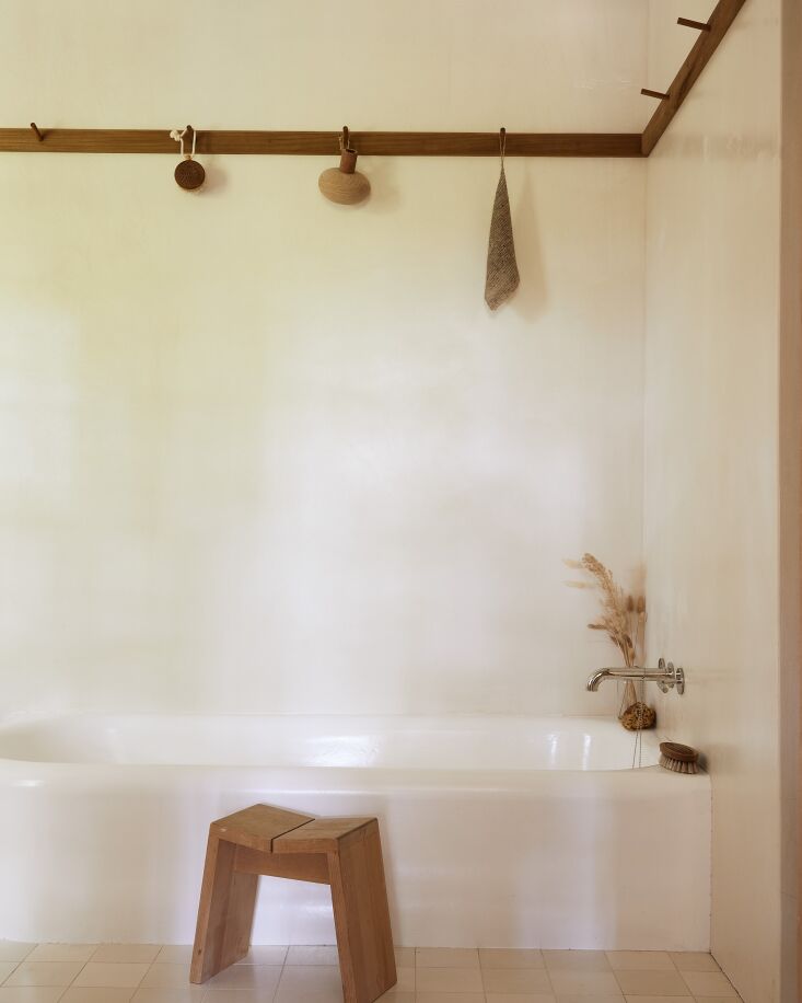 Above: The original bathtub was restored and paired with tadelakt walls by Devereux & Daughters and Huguet Cement tiles (selected by Maleeha, “after I compared every plain white tile sample under the sun before deciding it had to be one this one, just because I thought it had a very particular glow.”)