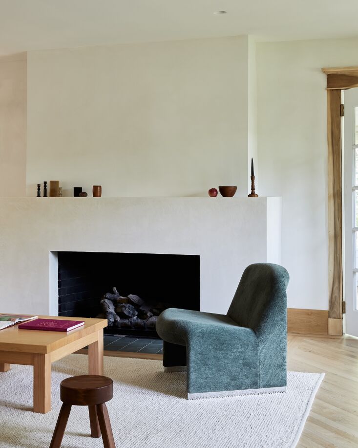 Above: The architects added a custom lime plastered fireplace surround created by Devereux & Daughters. The vintage Italian Alky Chair is in a Pierre Frey chenille, and the rug is the Palermo from Armadillo. Maleeha and Ian are currently contemplating art and window treatments for the room.,