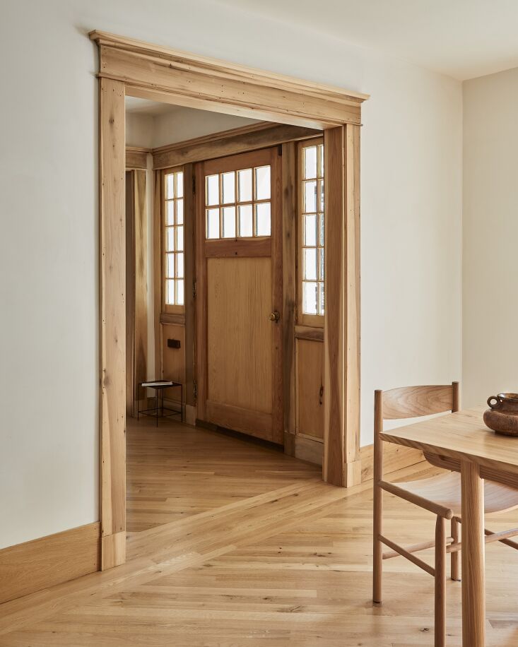 Above: The original front door and casework around the doors and windows throughout were stripped of many layers of paint—”Thom referred to their texture as cream cheese,” says Maleeha. “Revealing the original wood was such a great call; it adds so much warmth.”,