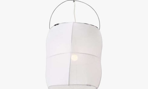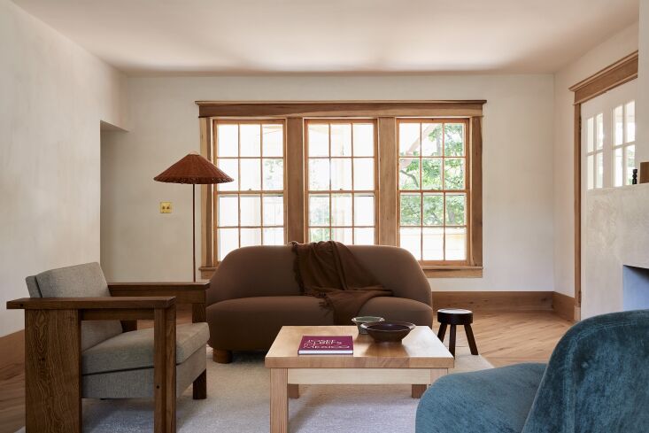 The walls are finished with eco-friendly Bauwerk limewash paint selected for its soft, nuanced surface. The &Tradition sofa is reupholstered in caramel wool from Kvadrat and the wicker light is Gubi’s “Chinese Hat” Floor Lamp, a now-classic design from 1935 (currently on sale at DWR).