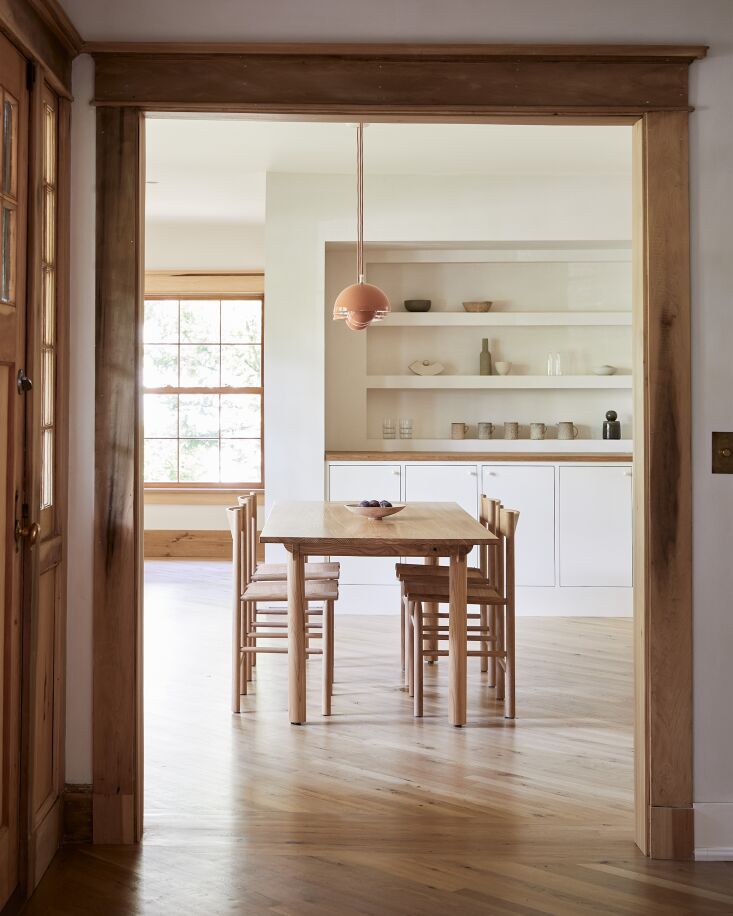 Shown here: the combination dining area and kitchen off the entry with original stripped casework, a custom ash table, Akademia chairs by Nikari, and Verner Panton Flowerpot Pendant Lights. All of the new millwork was built by the project contractor, DTF Rosemount, a Westchester and Connecticut firm much recommended by TBo.