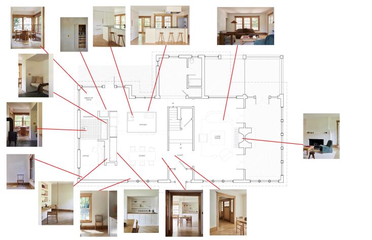 Above: Formerly a warren of small, dark rooms, the ground floor is open and bright—with few doors but plenty of quiet spots. Note the multipurpose cabinet bank that serves the kitchen, office, and inglenook.