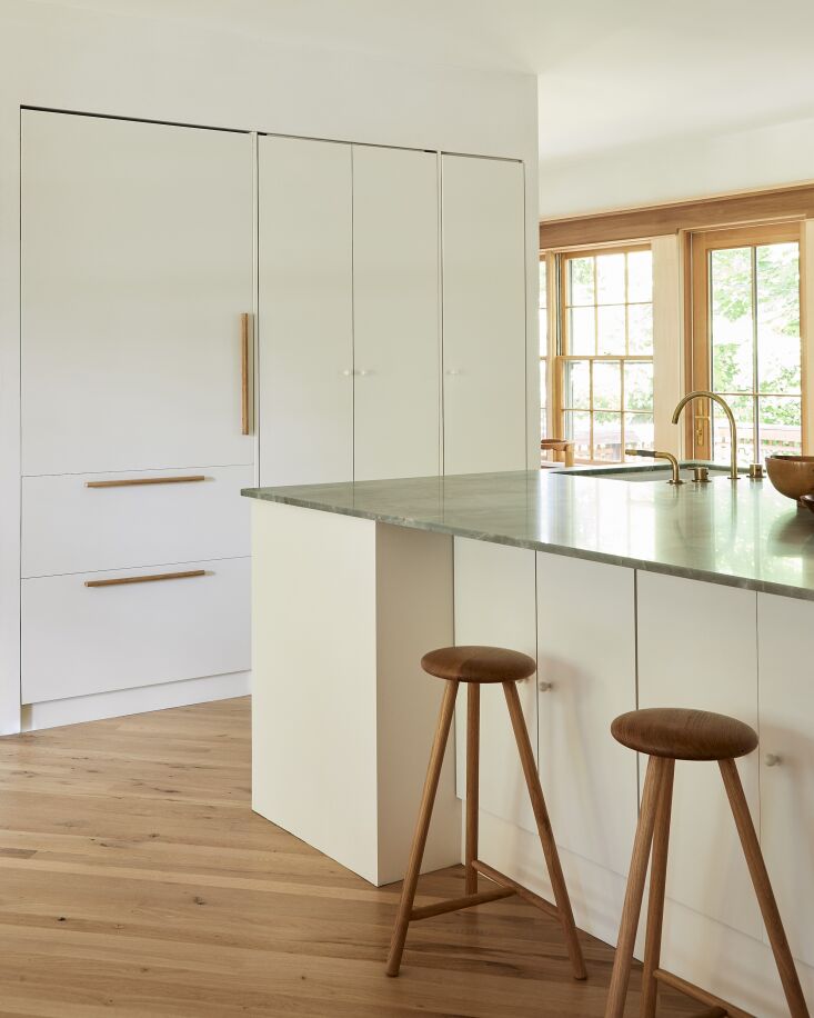 The old, warped flooring was replaced with white oak from Provenance, laid on the diagonal to guide the eye and lend some tonal pattern to the tranquility. Adding the new floor provided an opportunity to replace the cast-iron radiators with radiant heat. “The heated floor feels so good underfoot on winter mornings,” adds Maleeha. The family packed up everything and lived in an apartment during the construction.