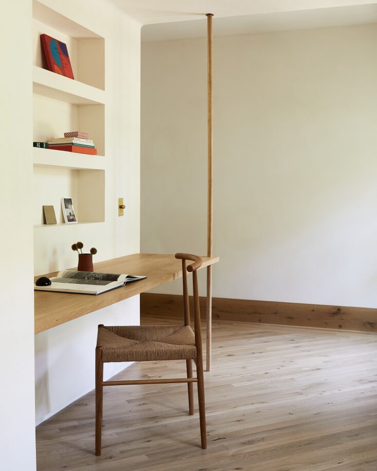 Above: Alongside the inglenook, there’s a built-in desk for two with a floor-to-ceiling support. The walls on this side of the cabinet bank are lime plastered with niches that offer a place for storage and display.