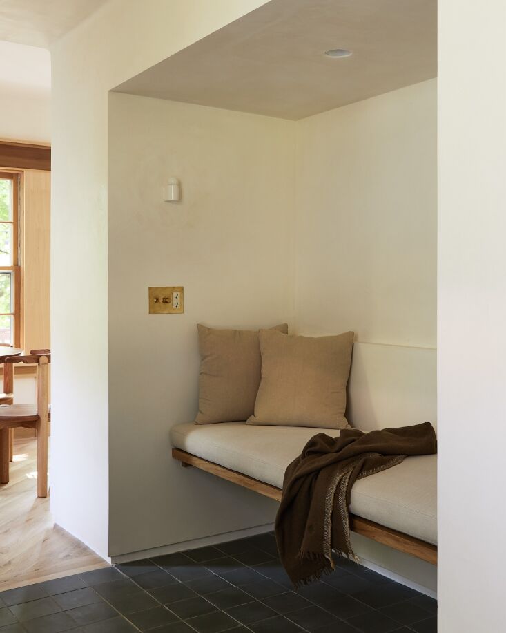 Above: The oak bench is built into the back of the pantry volume. “Maleeha and Ian wanted to create small areas for quiet activity and repose even within the mostly open floor plan,” says Bretaigne.
