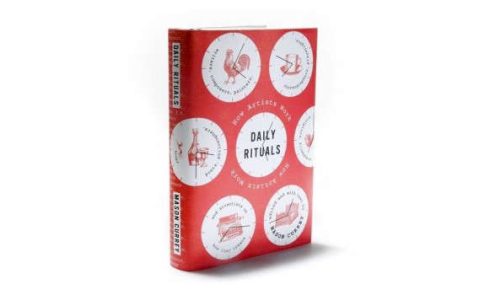 Where to Drink Coffee from Phaidon, a stack of Stilleben Maroon Bowls and Stilleben Midnight Blue Bowls, a vintage glass pitcher, and an Iittala Kartio Pitcher. On the lower shelf are Stilleben Midnight Blue Cups and Stilleben Light Grey Cups.