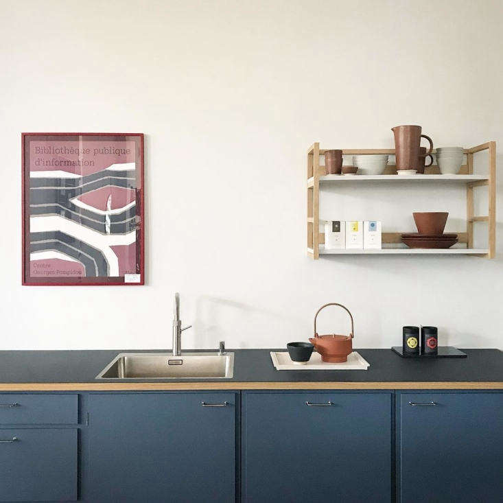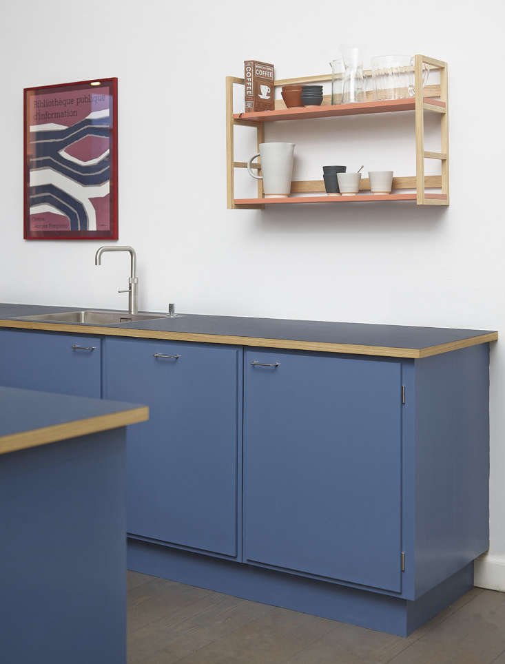 Above: Over the counter is a framed vintage poster from the Centre Pompidou and on the counter is a large ceramic Midnight Blue Bowl from the Stilleben line of tableware and a Skagerak Edge Teapot on a Cassette Tray.