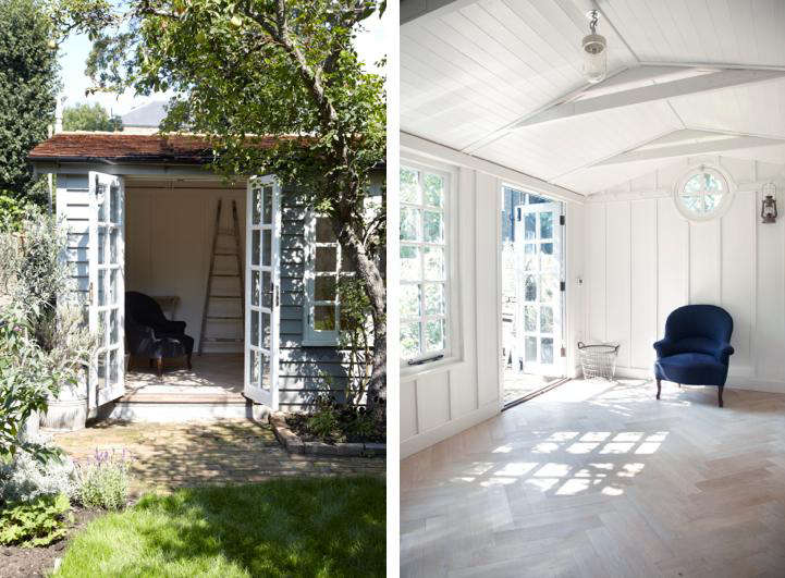 Above: While the summerhouse was installed by The Garden House, Hutchinson customized it with bespoke windows, flooring, doors, and panelled walls.