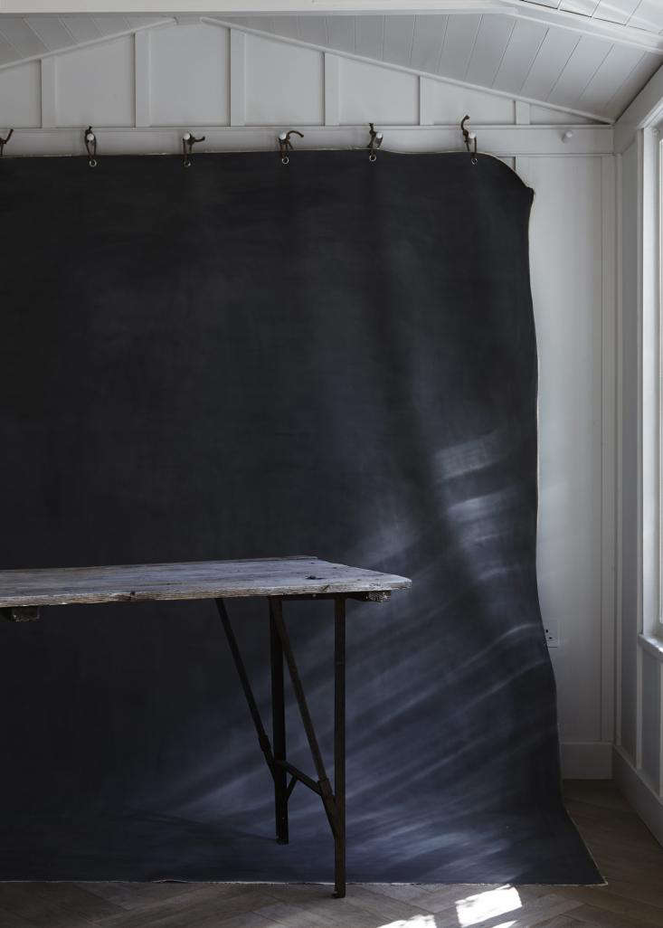 Above: Hutchinson installed Shaker pegs around the room for the easy hanging of props and backdrops like this artist’s canvas which she painted herself.