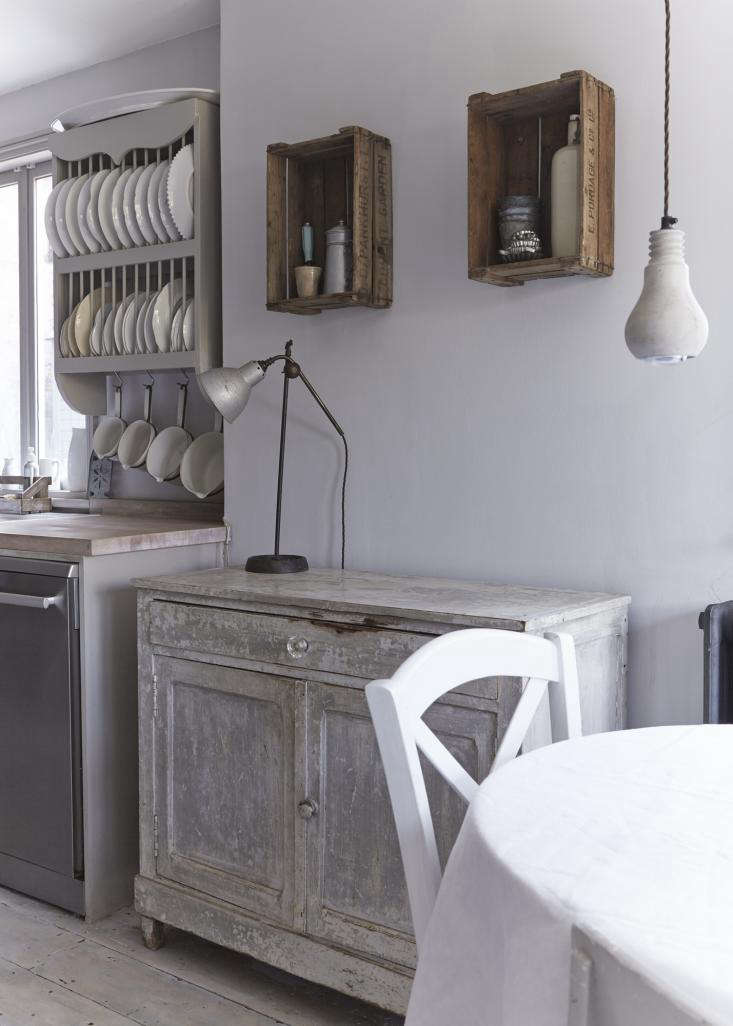 Above: Apple crates hang on the wall and are used as storage, while a dresser has been made from antique shutters. “My motto is ‘It’s all in the mix’,” she says. “So I like to add the unexpected to break things up a bit. I particularly love the Concrete Pendant Lights above the kitchen table and I like to use harder, more masculine industrial pieces, to add an edge.”