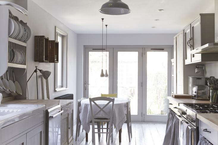 Above: “I am definitely influenced by my love of France,” Hutchinson says. “Particularly in the way they use old doors and shutters to make cupboards.” The use of curtains in the lower cabinets is a typical detail in French country kitchens (Twig uses Striped Navy Ticking from Ian Mankin). While Hutchinson’s kitchen cabinets are from Habitat, she customized them by painting them with Oak Apple from Fired Earth and by changing the handles to reclaimed sash window handles she sourced at Sunbury Antiques market.