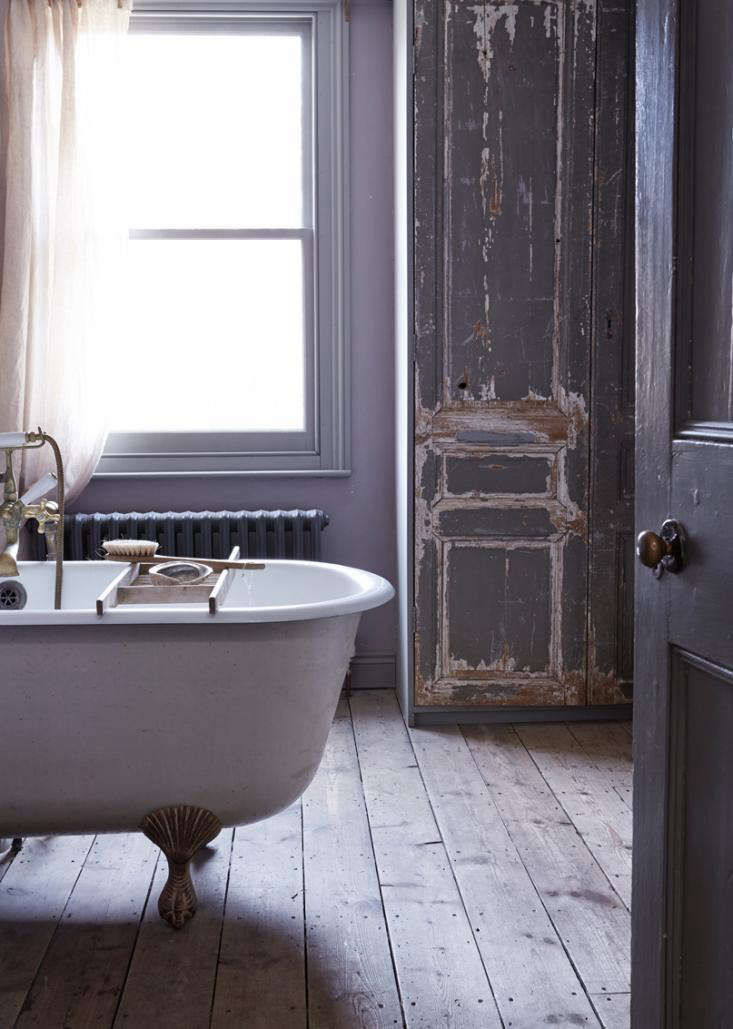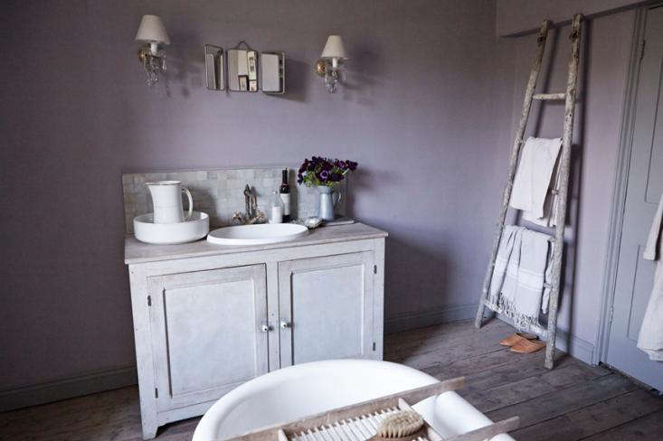 Above: “I wanted the bathroom to be really beautiful and not just functional so I chose a deep lilac/gray color for the walls,” Twig says. “I guess I wanted it to be a bit like a sitting room, where you would want to spend lots of time.” The bathtub is an original French bathtub from the 1920s, sourced from Water Monopoly. The linen cupboard is made from old French doors.,
