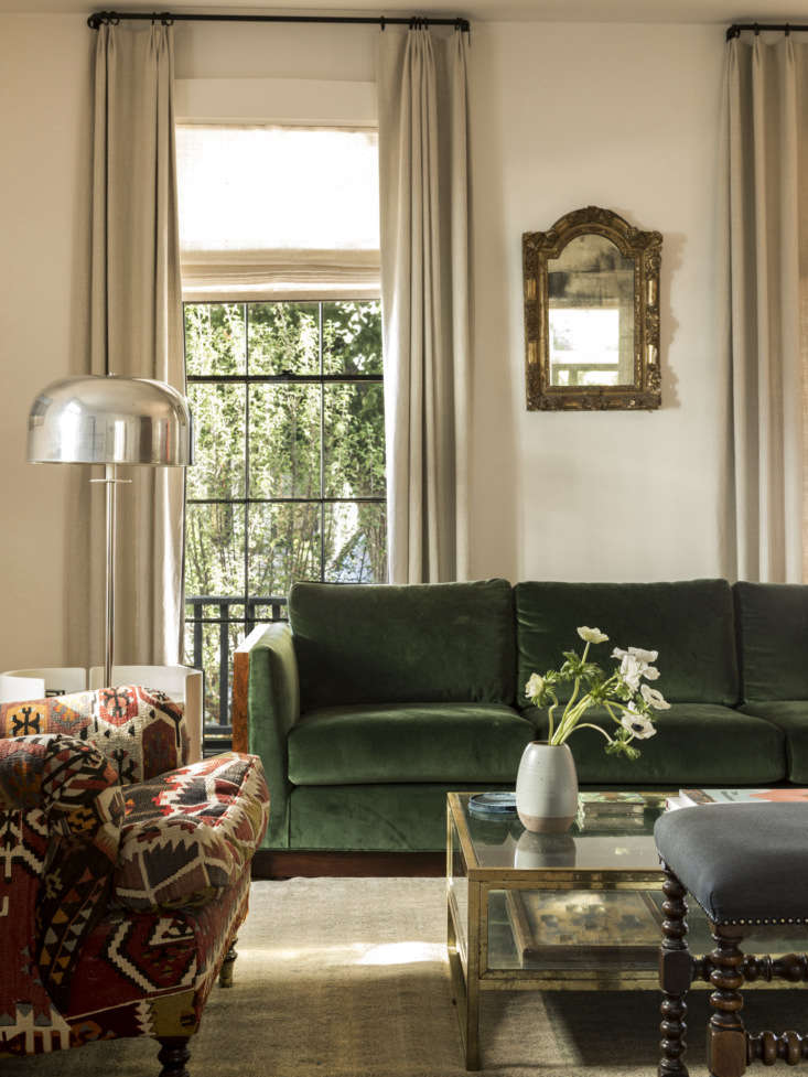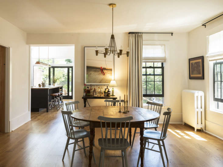 Above: Zell has frequent houseguests, many of them cyclists—he himself is a rider and, in addition to being a craft coffee impresario, is cofounder of Allied Cycle Works, makers of carbon fiber road bikes. He says his round dining table—a 19th-century French drop-leaf design—helps the room feel less formal and enables group conversation. The Salt Dining Chairs are from DWR. The Carters found the mid-century brass chandelier on 1st Dibs.