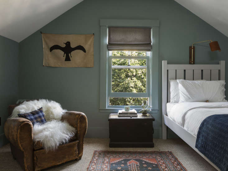 Above: The attic got divided into an office and Zell’s teenaged daughter’s room. The Shutter Bed is from Maine Cottage and comes in 35 colors (Oyster is shown here). The vintage crow flag came from Olde Good Things.