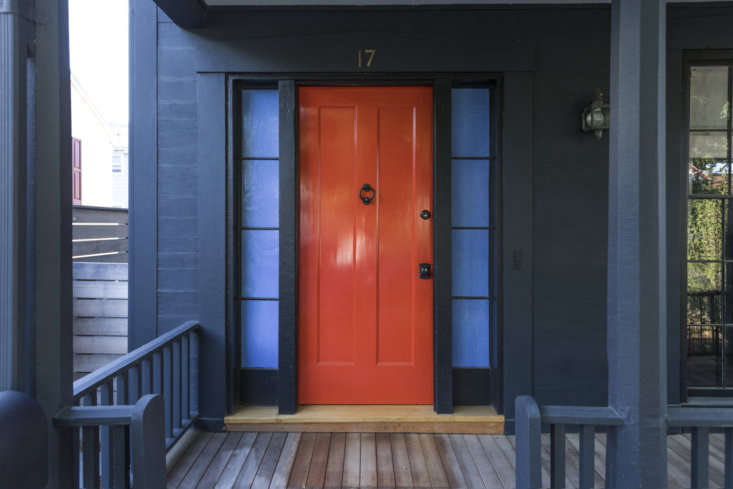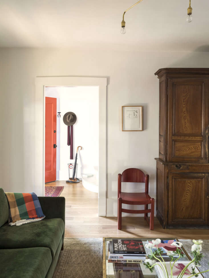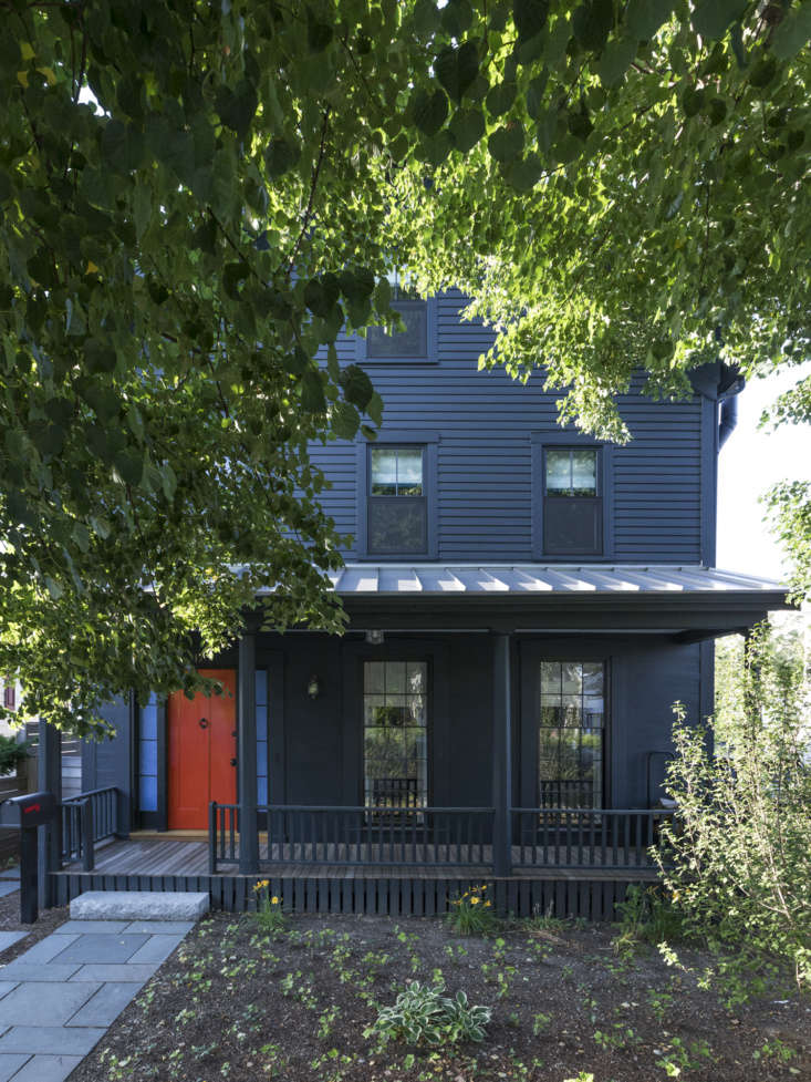 Above: The house was built in the 1880s in Cambridge’s Strawberry Hill neighborhood. Previously painted white, it was given a proper Boston color combo: Farrow & Ball’s Black Blue with a front door in a custom-mixed Fine Paints of Europe high-gloss matched to the British Standard Colour Poppy Red. A fan of “combining the serious with the playful,” Zell says the palette comes from the longstanding influence of British design in Boston,
