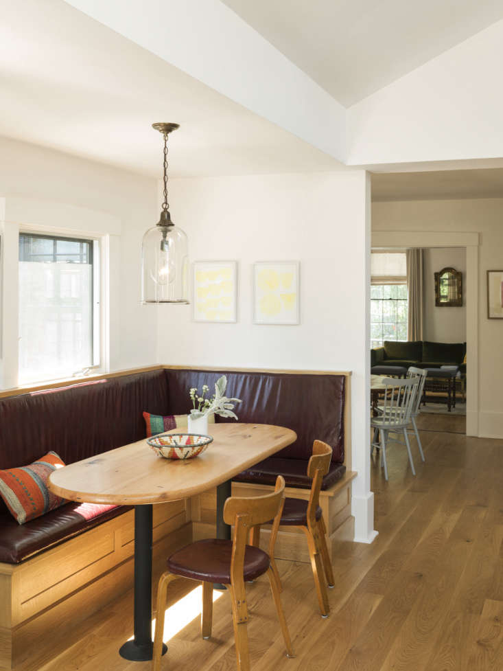 Above: One of the most used corners in the house is the breakfast nook. The Carters upholstered it in black cherry leather and designed the oval table. The pair of Alvar Aalto chairs, from Reside, came out of a library at Harvard.