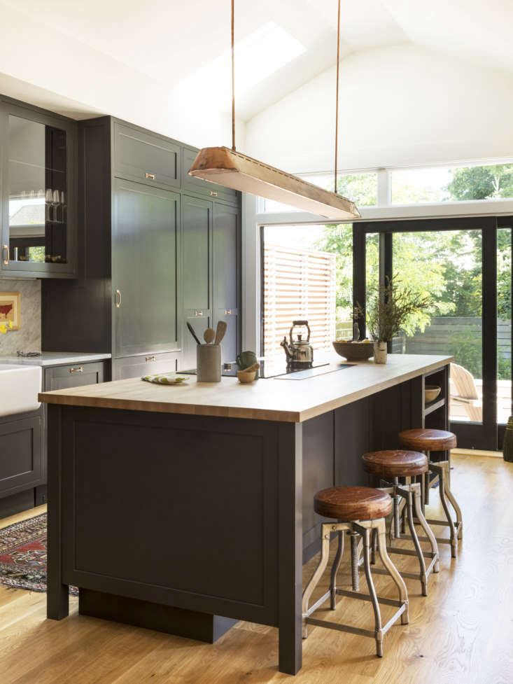 Above: The designers started from scratch in the kitchen, introducing custom Shaker-style cabinets and a center island topped with edge-grain maple butcher block. Bestor removed the ceiling to expose the gabled peak (with added skylights) and replaced French doors with a glazed back wall and slider.,