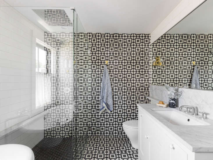 Above: “I like stuff with energy,” says Zell of the bathroom’s Fez concrete tile from Granada Tiles in LA —Bestor famously set off a trend 12 years ago, when she used the same pattern in blue in her Silver Lake Intelligentsia design: see our 2010 Restaurant Visit report.,