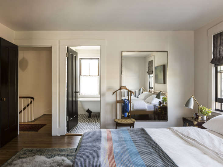 Above: Bestor reconfigured the second floor and transformed a space barely big enough for a bed into this en suite bedroom. The striped throw blanket is by Coyuchi; the Carters found the valet chair on Chairish.