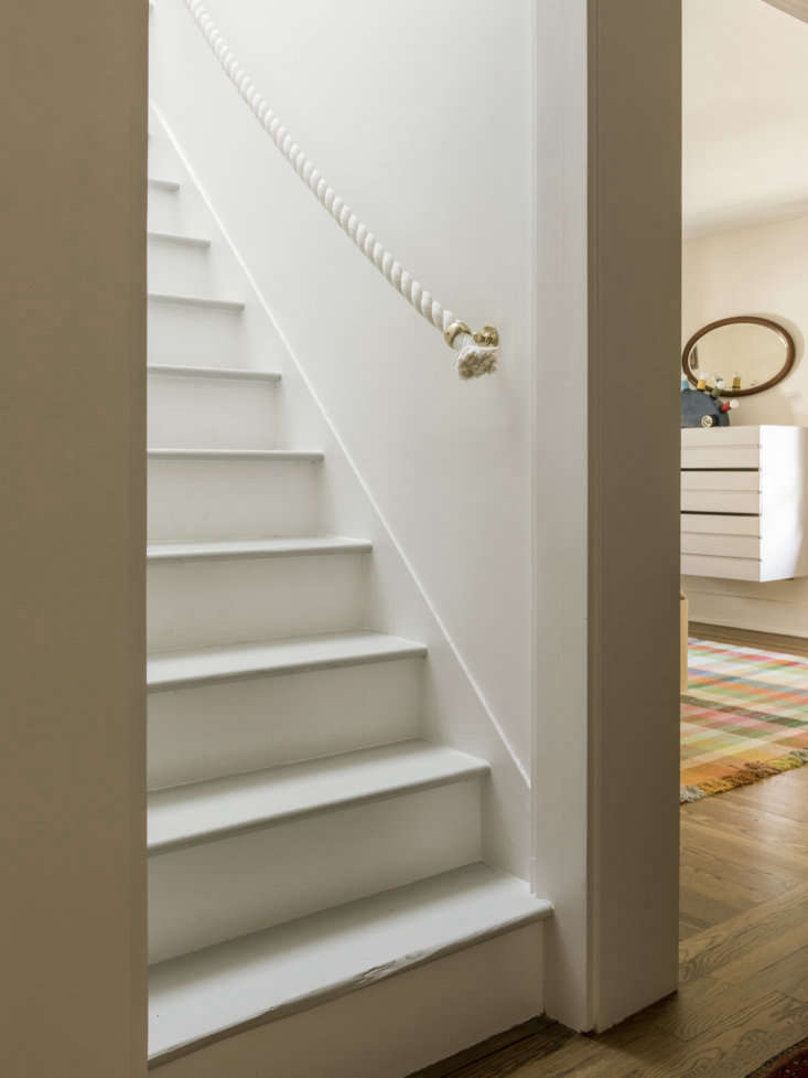 Above: A classic New England rope stair rail, a Remodelista favorite, leads to the attic. Through use, it will take on a patina over time.