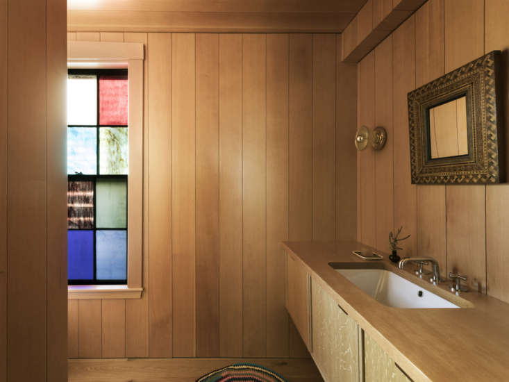 Above: Bestor used space from the dining room and an awkward existing bath to create a cabin-like powder room. Of the Douglas fir shiplap paneling Zell says, “I wanted this room to feel like a separate experience. I’m from Wisconsin, and I like the Northwoods sauna vibe.” In lieu of a shade or curtains, Bestor masked the view of the house next door by installing a colorful patchwork of stained glass.,