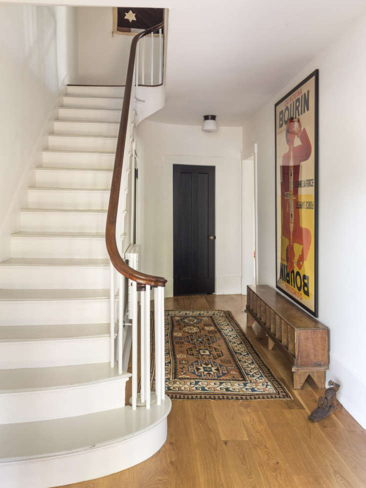 Above: The main hall and curved stair were kept as is. The bench, long ago assembled from an old French chicken coop, has cubbies ideal for mail. The steel shoe sculpture is by Massachusetts artist Madeleine Lord.