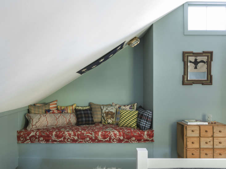 Above: The Carters piled an under-the-eaves bench with cushions made from Japanese fabrics and found remnants.