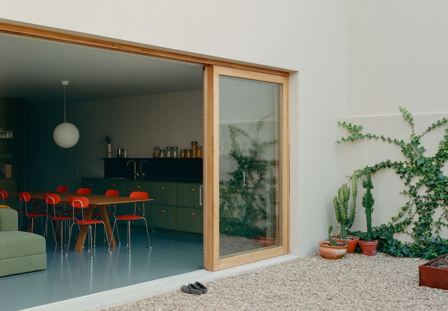 Above: The view from the courtyard to the inside. The orange Mariolina Chairs, designed by Enzo Mari for Magis, add an energetic contrast to the more muted blues and greens in the home.