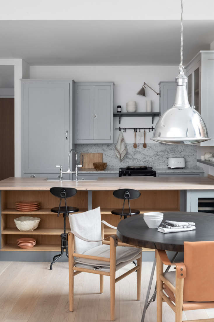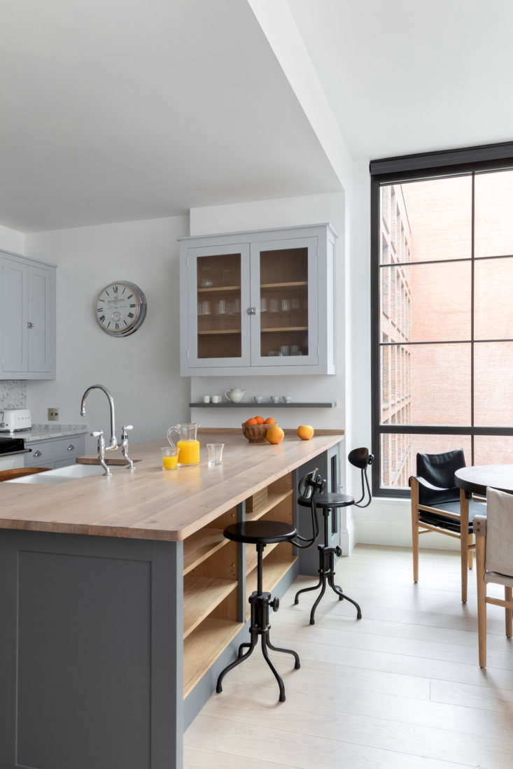 Above: A warm gray from Little Greene Paint & Paper was selected for the cabinets. The peninsula is painted “Draughty Passage” from Plain English’s own color collection.