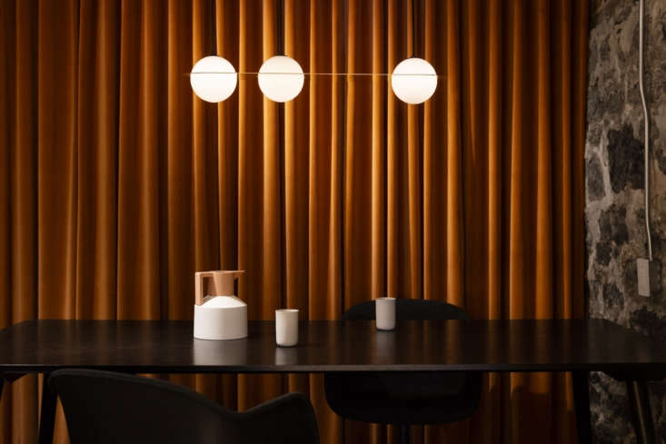 Above: On the other end of the floor is a conference room for visiting clients. Michael added orange velvet drapery for a “speakeasy atmosphere.”